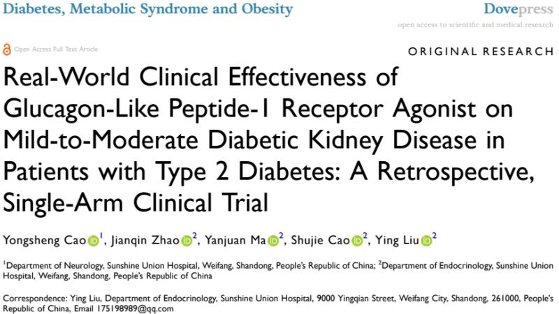 This retrospective, single-arm real-world study included a total of 364 patients with mild-to-moderate DKD who had been treated with GLP-1RAs for at least 6 months. A hundred and fifty-nine cases were administered PEG-Loxenatide (trade name: Fulaimei), 104 cases Dulaglutide, 52 cases Semaglutide, and 49 cases Liraglutide. The primary endpoint was hemoglobin A1c (HbA1c) levels after 6 months treatment[1].