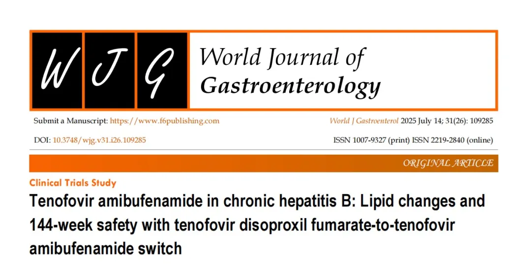 [1]Zeng ZH, Liu JQ, Zhang M, Qiu CL, Xu ZY. Tenofovir amibufenamide in chronic hepatitis B: Lipid changes and 144-week safety with tenofovir disoproxil fumarate-to-tenofovir amibufenamide switch. World J Gastroenterol 2025; 31(26): 109285